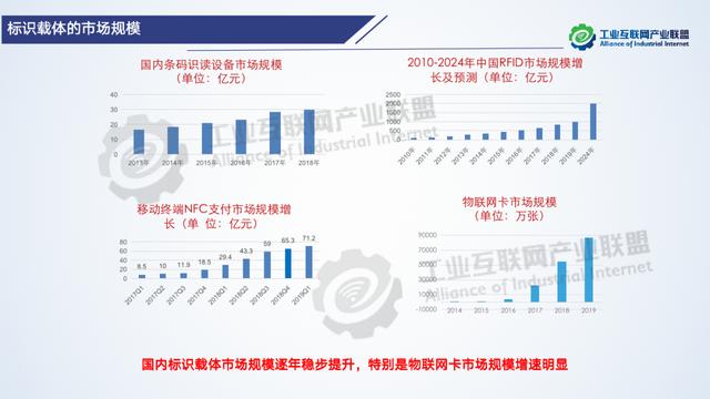 标识载体,就是指承载标识编码资源的标签。根据标识载体是否能够主动与标识数据读写设备、标识解析服务节点、标识数据应用平台等发生通信交互,可以将标识载体分为主动标识载体和被动标识载体两类。主动标识载体可以嵌入在工业设备内部,具备联网通信功能,能够主动向标识解析服务节点或标识数据应用平台发起连接,而无需借助标识读写设备来触发。未来将进一步加快推动主动标识应用和推广,加强核心技术研究,构筑标识产业生态;完善核心标准体系,加强国际标准合作;立足垂直行业需求,聚焦联动发展创新;构建安全防护体系,保障标识数据安全,以切实推动工业互联网标识产品和应用的规模化、标准化和低成本化发展,保持国内标识载体市场规模逐年稳步提升良好态势。